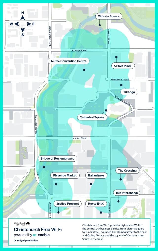 For details of the coverage, check out the Christchurch City Wi-Fi coverage area map [JPG, 280 KB]